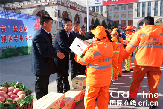 國際在線陜西消息:近日,“延安有我一棵(畝)蘋果樹”認養暨向環衛工人贈送蘋果儀式在陜西省延安市寶塔區舉行,寶塔區副區長賈君亮,延安治平集團總經理張明生,寶塔區委網信辦、寶塔區城管局、河莊坪鎮政府等相關部門領導,果農代表及環衛工人共200余人參加活動。