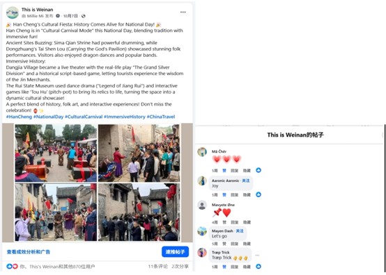 韓城在假日期間推出沉浸式古城遊、“國風+科技”互動體驗、夜遊燈光秀等系列活動,實現傳統文化與現代技術的深度交融,吸引遊客積極參與,線上傳播持續升溫。其中,“韓城開啟‘文化狂歡模式’,傳統與沉浸式趣味完美融合”相關內容在Facebook平臺瀏覽量突破3萬、單條點讚量超過800+,成為此次假期的文旅傳播亮點。