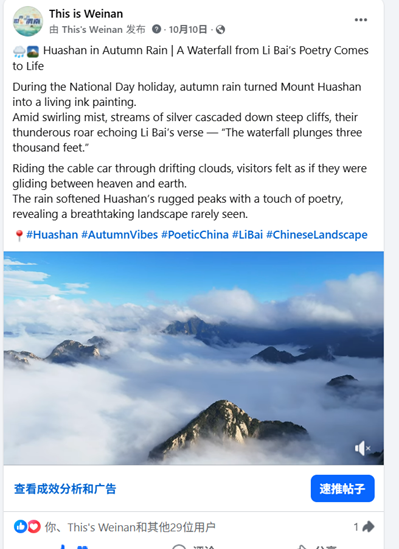 在文旅推介方面,華山、少華山、潼關古城等地成為海外網友感受中國大美河山的重要窗口。其中,“華山雲海奇觀”“華山再現李白詩詞裏的瀑布!”等帖文內容,以實景短視頻搭配古風文案的創意形式,營造出“人在詩中游”的沉浸意境,發佈後迅速引發熱烈討論,成為節日期間的傳播亮點。