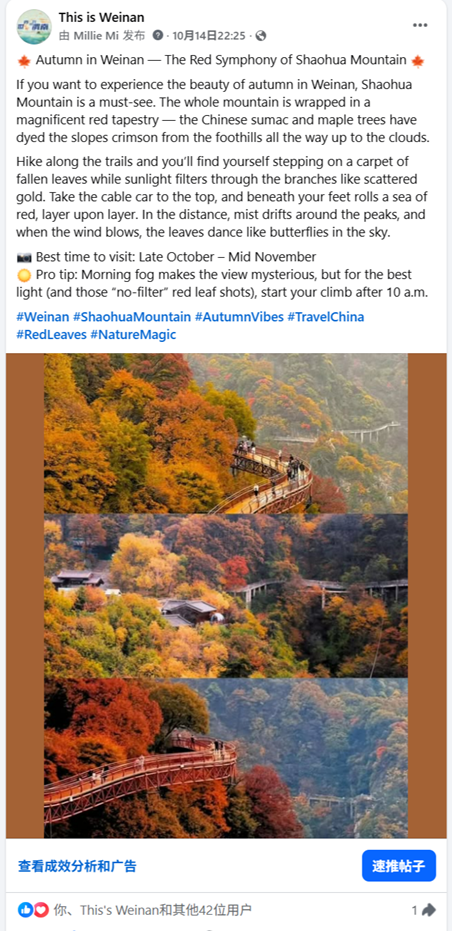 “紅葉燃秋色,少華山限時浪漫已上線”內容,以英語、韓語、法語進行多語種推廣,進一步拓寬海外觸達面,獲得大量點讚與互動,有效提升渭南文旅品牌的國際辨識度與關注熱度。“來潼關吧,秋天的潼關美得像一幅畫”帖文,憑藉古樸自然的視覺表現力打動海外受眾,以其獨特的秋日氛圍感吸引大量網友關注,持續放大潼關古城的文旅魅力。