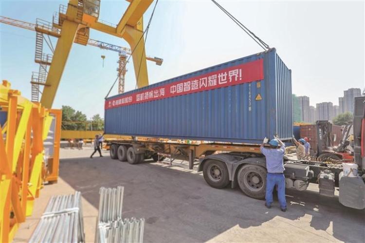 今年6月13日,在陜建機股份涇渭工業園,工人把即將發往俄羅斯的塔機産品結構件裝入集裝箱(資料照片)。 受訪單位供圖