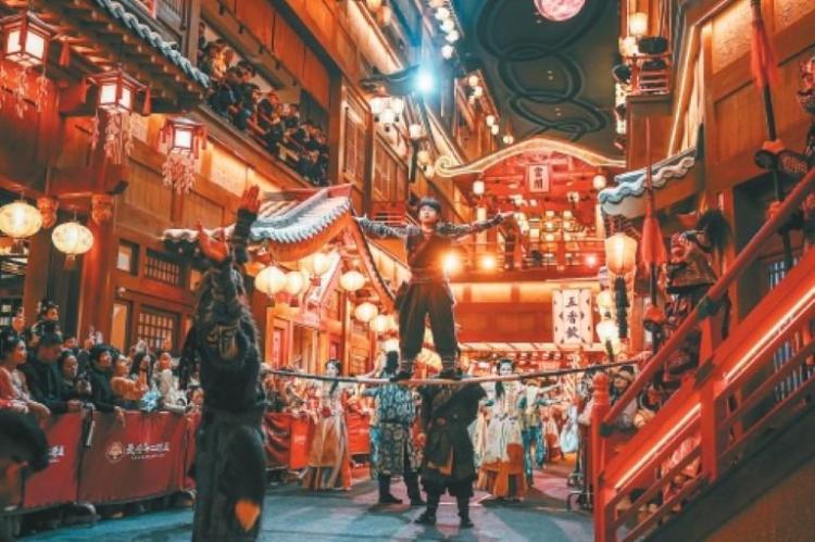 正月時節,步入長安十二時辰主題街區,麗人街上雜耍藝人正在《長安百藝》節目中使出渾身解數,引得眾人歡呼與掌聲;20余公里外的昆明池畔,民俗非遺技藝巡遊現場人聲鼎沸,大人孩子都看得目不轉睛;入夜的大唐芙蓉園中,“國潮百戲”主題唐詩燈影長卷,鋪開一幅夢幻畫卷……天上明月高懸,地上綵燈萬盞,新春裏的西安城最是一年熱鬧時,而勾欄瓦肆之間、人聲鼎沸之處,又數百戲鬧春的喧囂最盛。