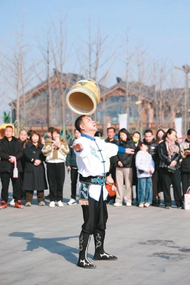 而當時光走過千年,那份熱鬧似乎從未改變:就如這個春節,昆明池池望廣場的頂缸表演,藝人頭頂瓷缸,旋轉、拋接一氣呵成,驚險處讓人攥緊手心;卷雲臺的木偶戲臺,表演者在一桿一提間,讓木偶眉眼靈動、動作傳神,經典故事鮮活上演;易俗社文化街區戲臺上的演員每天都演得陶醉,走雲顛步,甩袖揚眉,妙趣橫生,台下圍觀者眾,遊人如織,好不熱鬧。