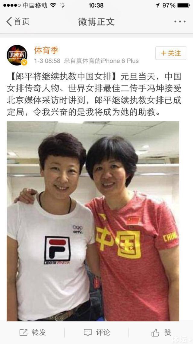 有關女排帥位的歸屬是中國體育界現在最難猜想的謎團了。一大早,有一條消息在自媒體平臺瘋傳:元旦當天,馮坤接受北京媒體採訪時講到,郎平執教女排已成定局,令我興奮的是我將成為她的助教。