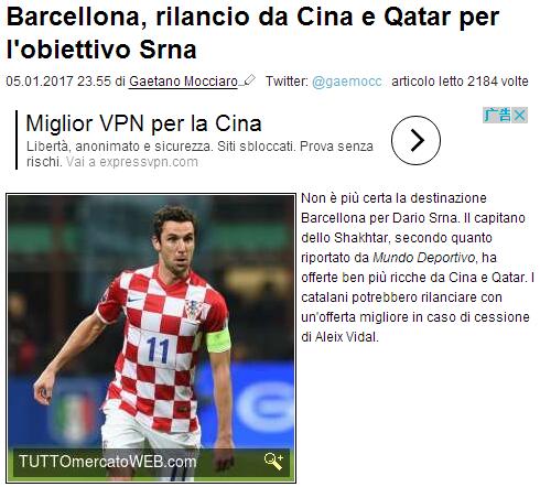 意大利媒體《全市場》援引《世界體育報》報道稱,想簽下克羅地亞國腳斯爾納的球隊不只巴塞羅那一支,中國和卡塔爾的球隊也對他提出了報價。巴塞羅那正謀求出售隊中後衛阿萊克斯·比達爾,而斯爾納被視為頂替比達爾的合適人選。至於是哪支中國球隊對斯爾納提出報價,文章中並未指出。