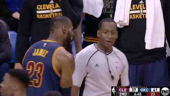 有意思的是,他這一球也算是被奧拉迪波干擾了,雖然對手並沒有碰到他。勒布朗見扣飛後,順勢往地下一趴,還往前一滑,做出了一副被對手推翻的樣子。裁判就在勒布朗身邊,但沒吹奧拉迪波犯規。這下勒布朗不幹了,立刻跳起來找裁判理論,但裁判也沒有改判。