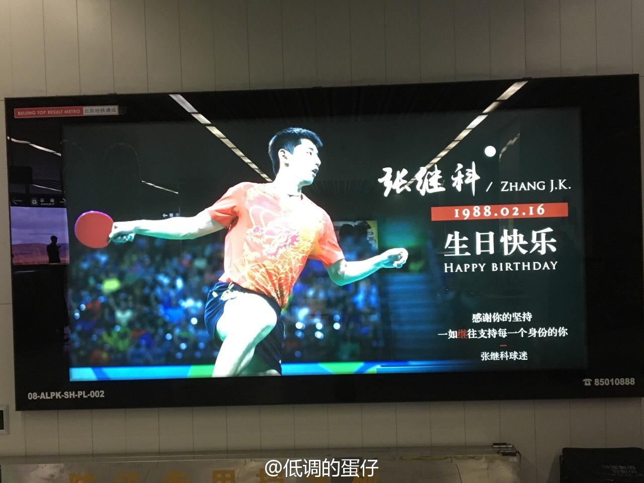 球迷選擇在北京地鐵奧林匹克公園站投放了地鐵站檯燈箱廣告,“張繼科生日快樂!感謝你的堅持,一如繼往支持每一個身份的你。”