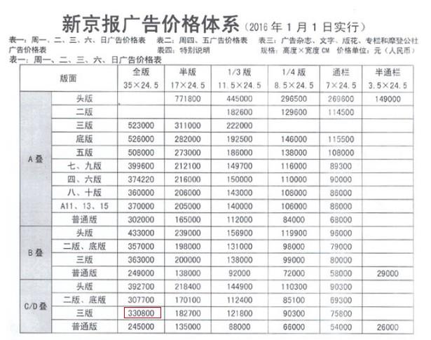 網易體育了解到,該版廣告刊登于C疊整版廣告價格為33萬餘元。