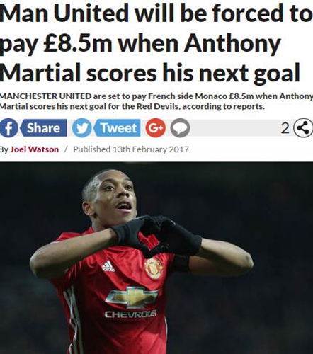 馬夏爾這位上個賽季表現出色的法國球星本賽季發揮低迷,在許多媒體看來,他在曼聯已經沒有了未來,熱刺很可能會是馬夏爾的未來東家。馬夏爾在對戰沃特福德的比賽中打入一球,在曼聯的進球數已經逼近25球(目前是24球),如果馬夏爾再為曼聯打入一球,紅魔就會想摩納哥多支付850萬英鎊。