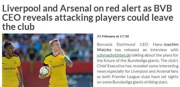 瓦茨克對於球隊鋒線雙星的轉會傳聞做出了回應,他表示:“我們的前場有很多出色的球員。至於他們的未來,什麼都有可能發生。”同時,他認為奧巴梅揚的轉會費至少要在8000萬歐元,而羅伊斯轉會的心裏價位他並沒有透露。