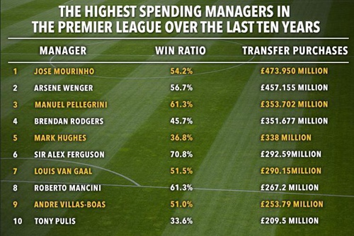 《太陽報》統計了最近10年來英超花錢最多的前十主帥,其中還列出了各位主帥的勝率。穆裏尼奧成為英超花錢最多的主帥,累計達到4.7395億英鎊,這並不令人感到意外,去年夏天穆帥就砸下了8900萬英鎊引進博格巴,成為了他執教英超生涯最大手筆的引援,此外,在二進宮切爾西時期,穆帥分別引進了迭戈-科斯塔(3200萬鎊)、威廉(3000萬鎊)、法佈雷加斯(2700萬鎊)等重量級球星,不過在勝率方面,穆裏尼奧僅有54.2%的勝率排名該榜單的第五名。