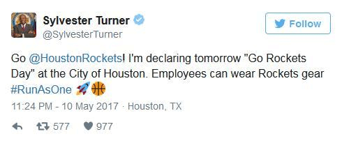 休斯敦市長西爾維斯特-特納宣佈,明日是“火箭加油日”,他鼓勵城市員工、休斯敦市民都穿上火箭的裝備給火箭加油助威。