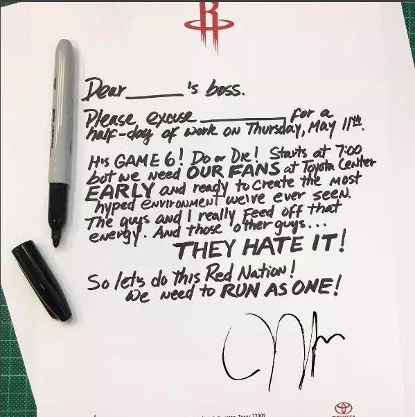 5月12日,2016-2017賽季NBA季後賽火箭隊與馬刺隊的西部半決賽迎來第六場較量,但由於當天是工作日,火箭隊當家球星哈登親自為球迷寫請假條,希望球迷能夠來到現場。但遺憾的是,那場比賽並沒有特別多的火箭球迷到場,而比賽中火箭還大比分落後,來的不少球迷更是提前退場。而哈登寫請假條的水準,真不是吹毛求疵,跟這位國安球迷想去甚遠。