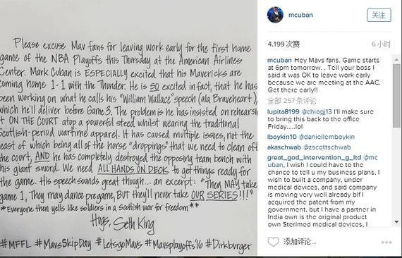 2015-2016賽季NBA季後賽首輪,面對強大的雷霆,小牛帶著1-1的總比分回到主場,但第三場對決恰逢工作日,小牛老闆庫班寫信致球迷,希望球迷能夠早下班來為球隊加油。