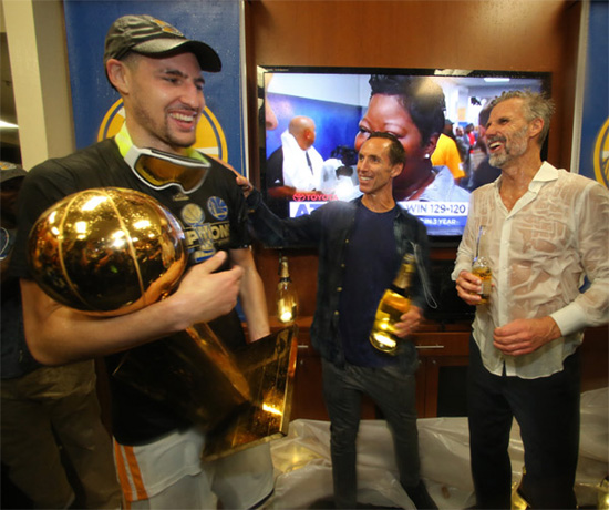 如今勇士隊奪冠,納什圓夢將獲得1枚總冠軍戒指。而在慶功期間,納什非常興奮,現身更衣室的他除了手拿香檳酒之外,還偷偷親吻了總冠軍獎盃。