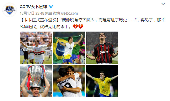 北京時間12月17日,35歲的前金球獎、世界足球先生得主卡卡在一檔電視節目中宣佈退役,結束了自己長達16年的球員生涯,“我作為一名球員的征程結束了。”