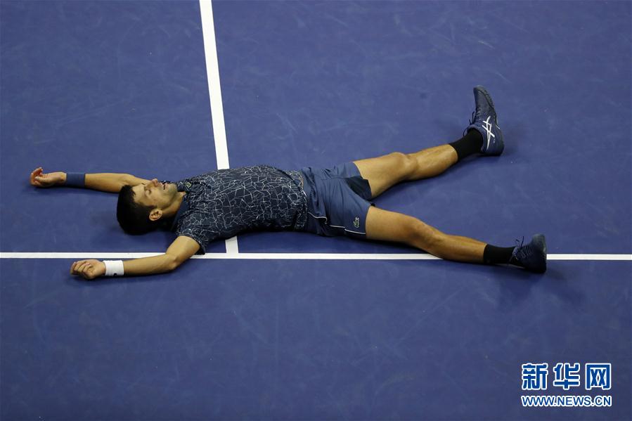 9月9日,焦科維奇在獲勝後倒地慶祝。 當日,在2018美國網球公開賽男子單打決賽中,塞爾維亞選手焦科維奇以3比0戰勝阿根廷選手德爾波特羅,奪得冠軍。 新華社記者李木子攝