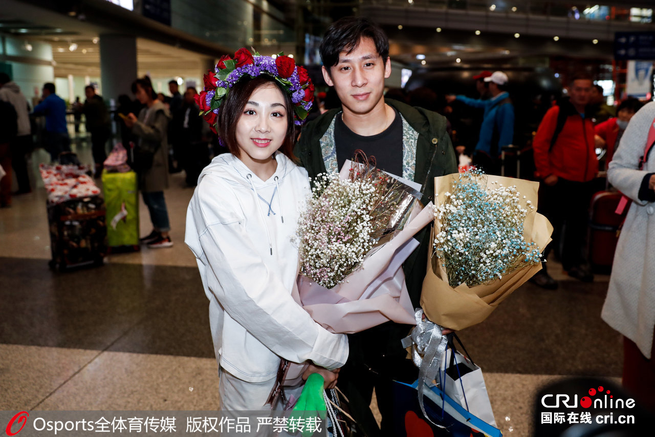 2019年3月25日,北京,花樣滑冰隊載譽回國,隋文靜、韓聰被媒體團簇。