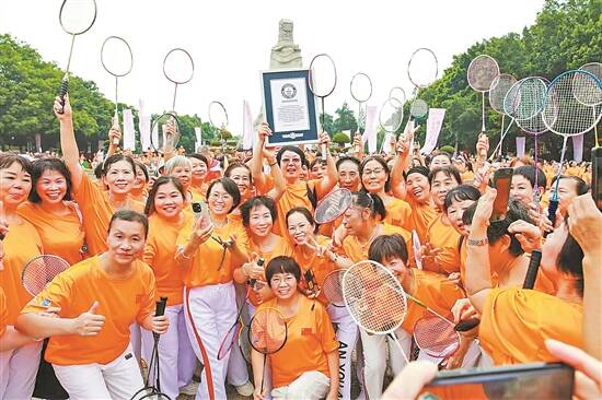 由南沙羽協專業團隊創編的羽毛球操充分融入灣區體育文化和羽毛球運動特色,以《擊出關鍵》《一起向未來》作為主題配樂,集技術動作、體能鍛鍊與團隊協作為一體,自推廣以來便廣受運動愛好者歡迎。主會場中,廣州攜手灣區各城市組成2000人挑戰方陣,同時與北京、上海、香港等13個分會場實時連線,線上線下共同完成這場萬人羽毛球操展演,場面熱烈、氣勢磅薄。吉尼斯世界紀錄官方代表現場認證,本次活動成功創造“最多人同時表演羽毛球操”的全新紀錄。