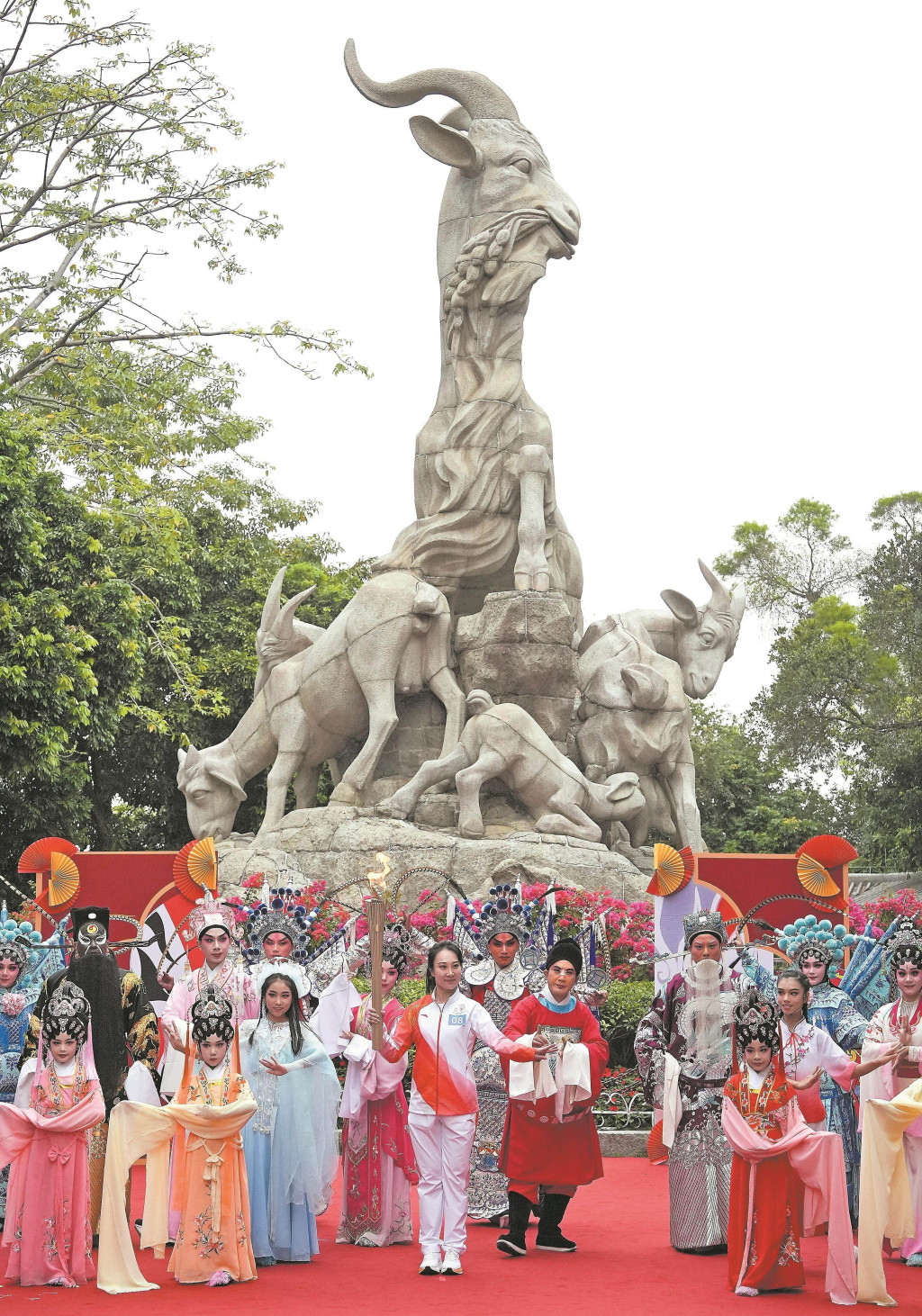 火炬傳遞至廣州越秀公園內的五羊雕像前