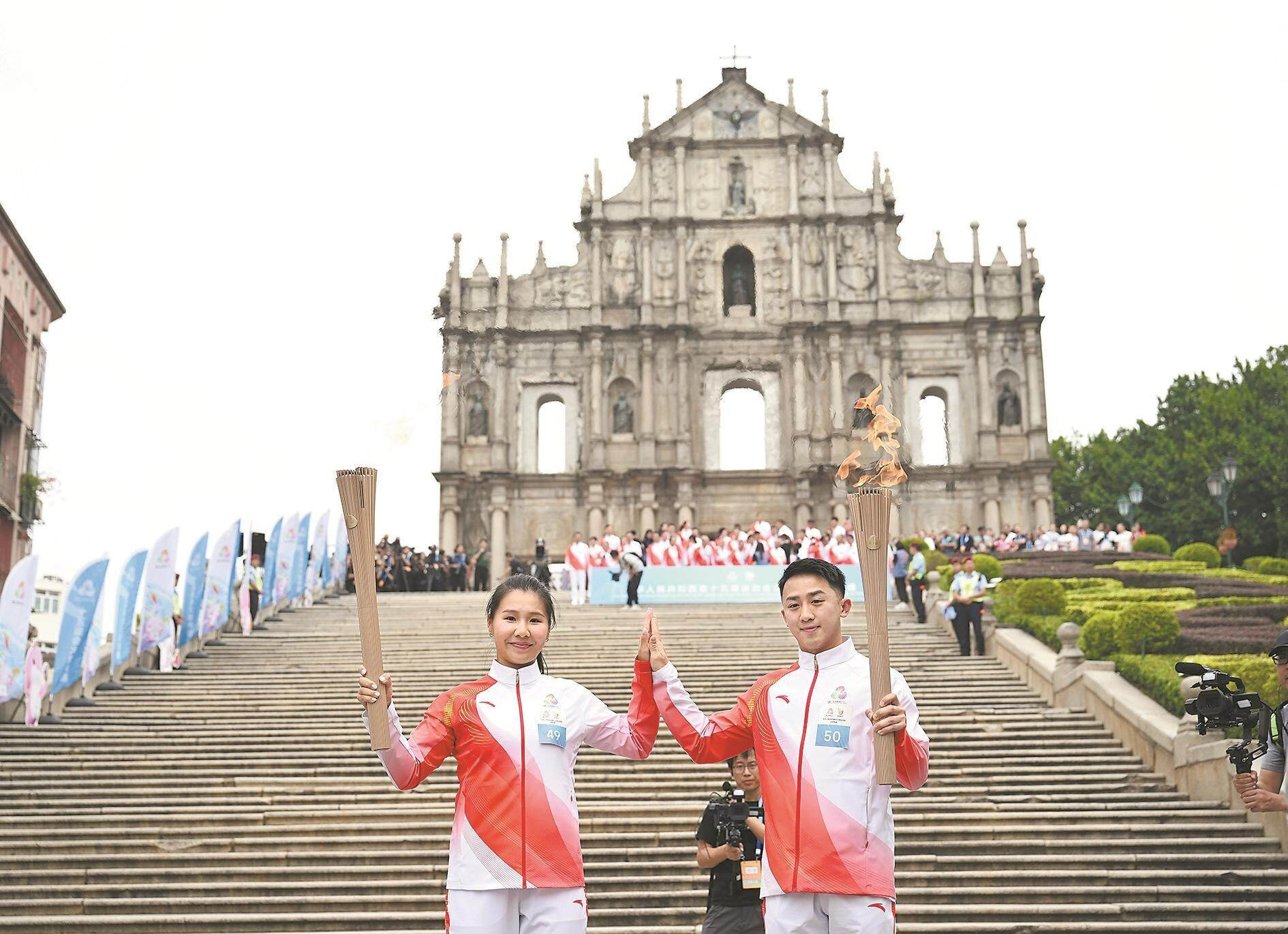 火炬手郭建恒(右)、區海欣在大三巴牌坊前傳遞火炬