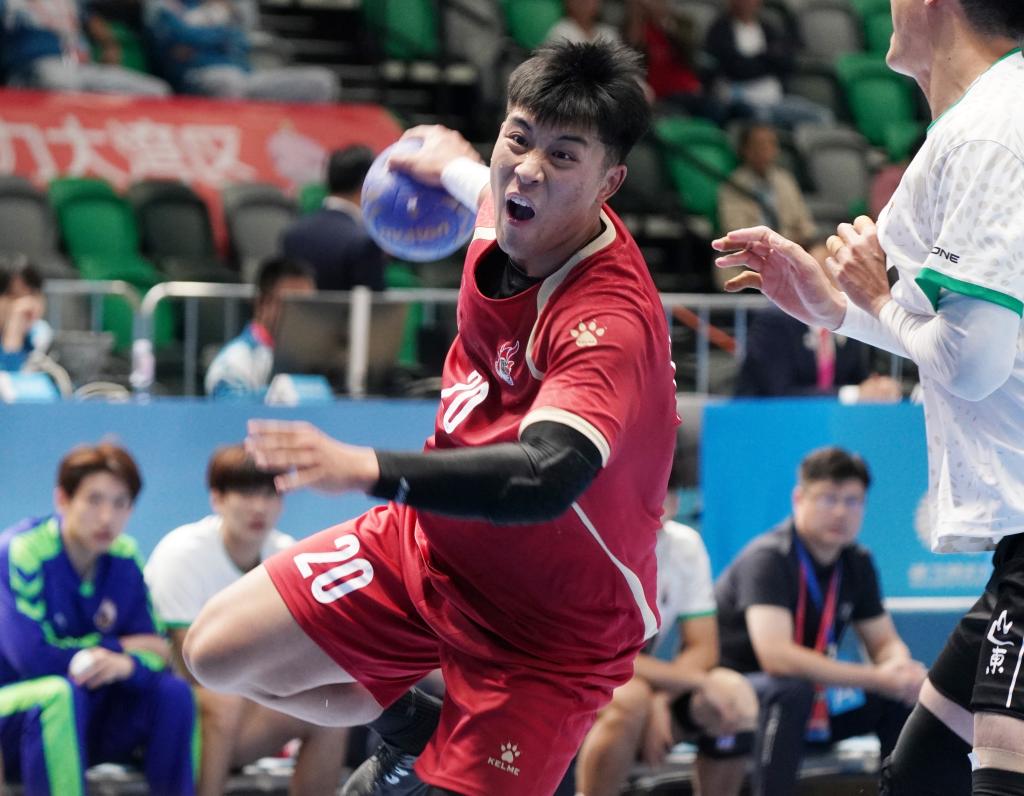 11月3日,山西隊球員劉文東(左)在比賽中進攻。當日,在香港啟德體藝館舉行的第十五屆全國運動會男子手球預賽B組比賽中,山西隊33比32戰勝山東隊。新華社發 (王申 攝)