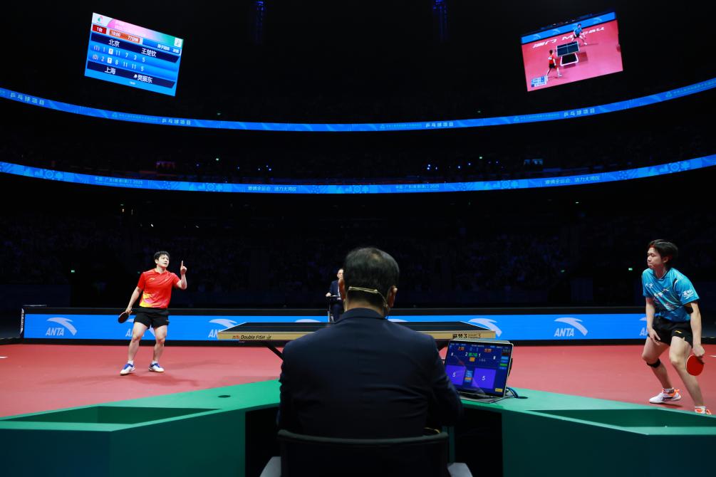 首盤,馬龍/黃友政對陣許昕/周愷。兩對組合在首局的較量就充滿波折,馬龍/黃友政6:2取得領先,許昕/周愷連追7分反超,北京組合再追5分,以11:9拿下。之後,兩對組合各取一局。關鍵的第四局,北京隊5:4領先時,上海隊請求暫停。暫停歸來,北京隊繼續連勝勢頭,11:7拿下第一盤。