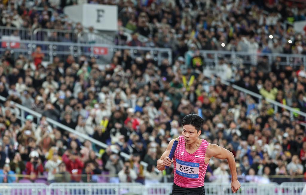 新華社廣州11月20日電(記者周暢、劉旸、張武岳)蘇炳添高舉右手,向幾近滿員的觀眾席致意,隨後和隊友一起,雙手從右下方合攏後往前發出“衝擊”。