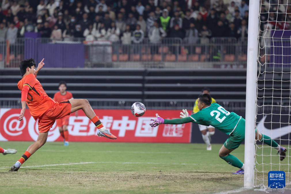 11月26日,中國隊球員李銘傑(右二)在比賽中頭球破門。