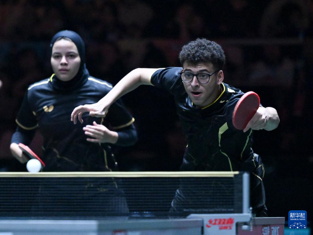 12月1日,埃及隊組合巴德爾·穆斯塔法(右)/瑪爾娃·阿爾霍達比在混雙比賽中。他們0比3不敵中國隊組合蒯曼/林詩棟。