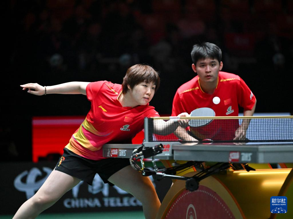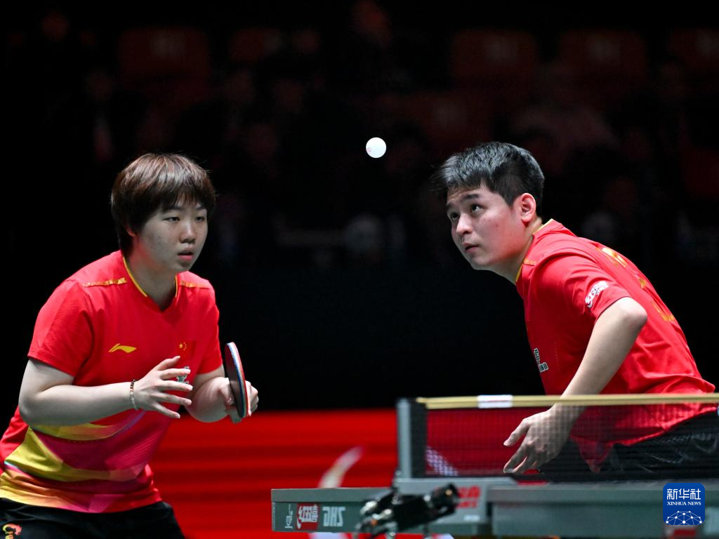 12月1日,中國隊組合蒯曼(左)/林詩棟在混雙比賽中。他們3比0戰勝埃及隊組合巴德爾·穆斯塔法/瑪爾娃·阿爾霍達比。