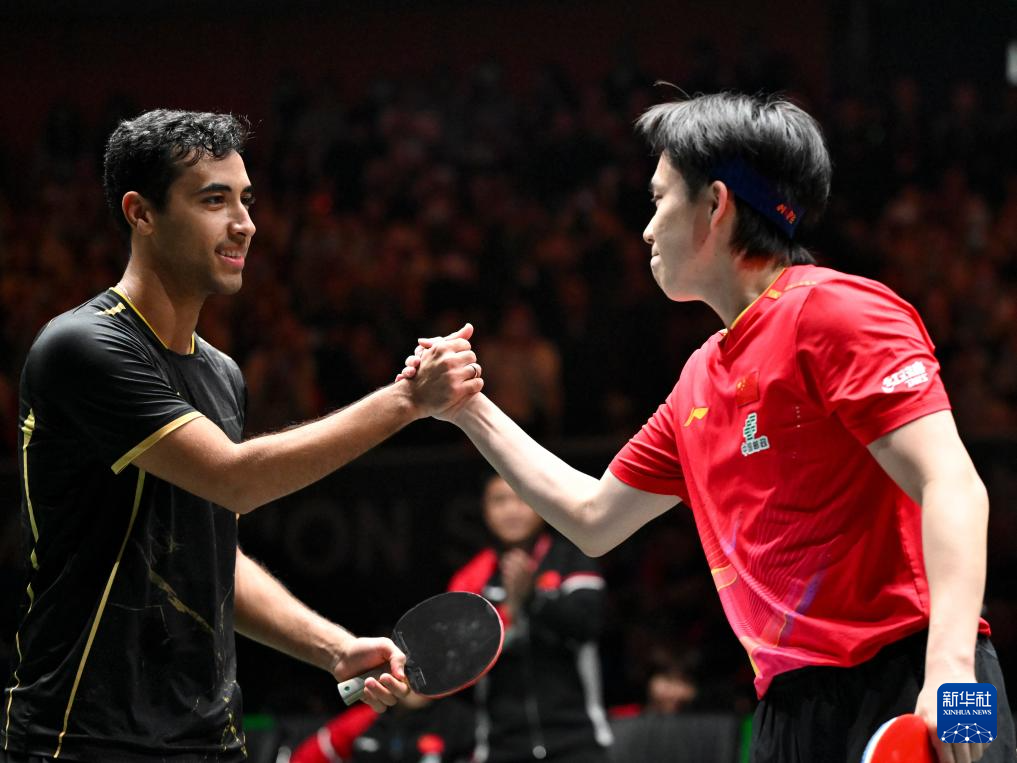 12月1日,埃及隊選手約瑟夫·阿卜杜拉齊茲(左)和中國隊選手王楚欽在賽後致意。王楚欽2比0戰勝約瑟夫·阿卜杜拉齊茲。
