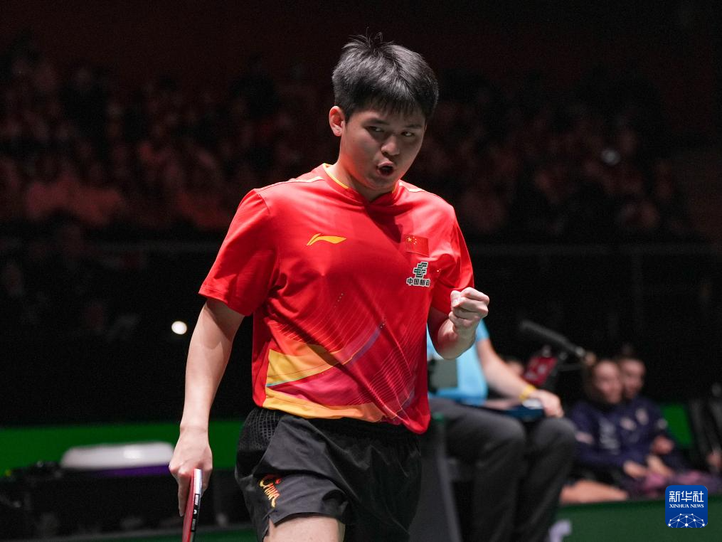 12月3日,中國隊選手林詩棟在男單比賽中慶祝得分。他2比0戰勝克羅地亞隊選手托米斯拉伕·普卡。