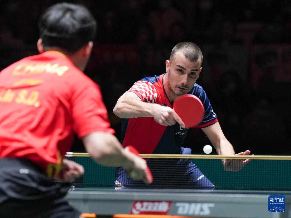 12月3日,克羅地亞隊選手托米斯拉伕·普卡在男單比賽中。他0比2不敵中國隊選手林詩棟。