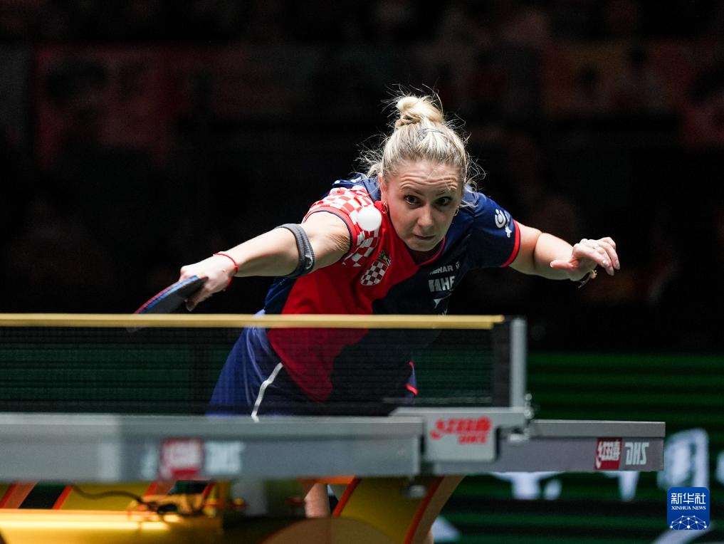 12月3日,克羅地亞隊選手伊凡娜·馬洛巴比克在女單比賽中回球。她0比3不敵中國隊選手蒯曼。
