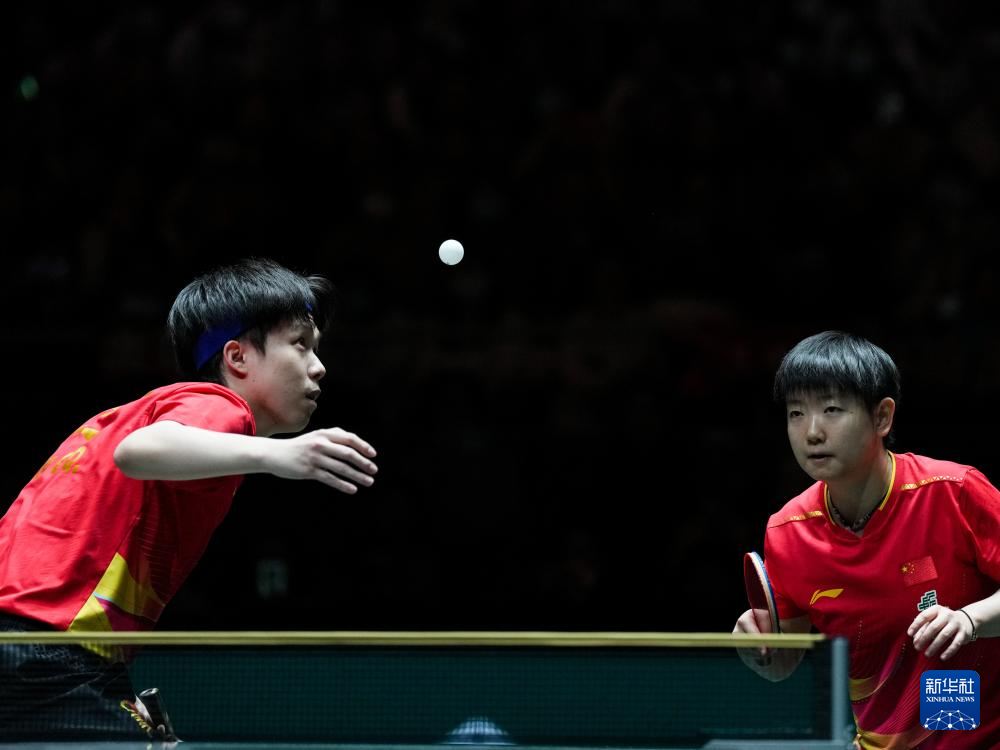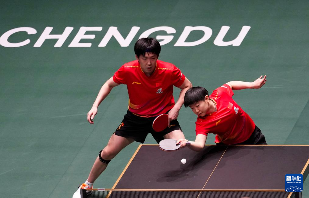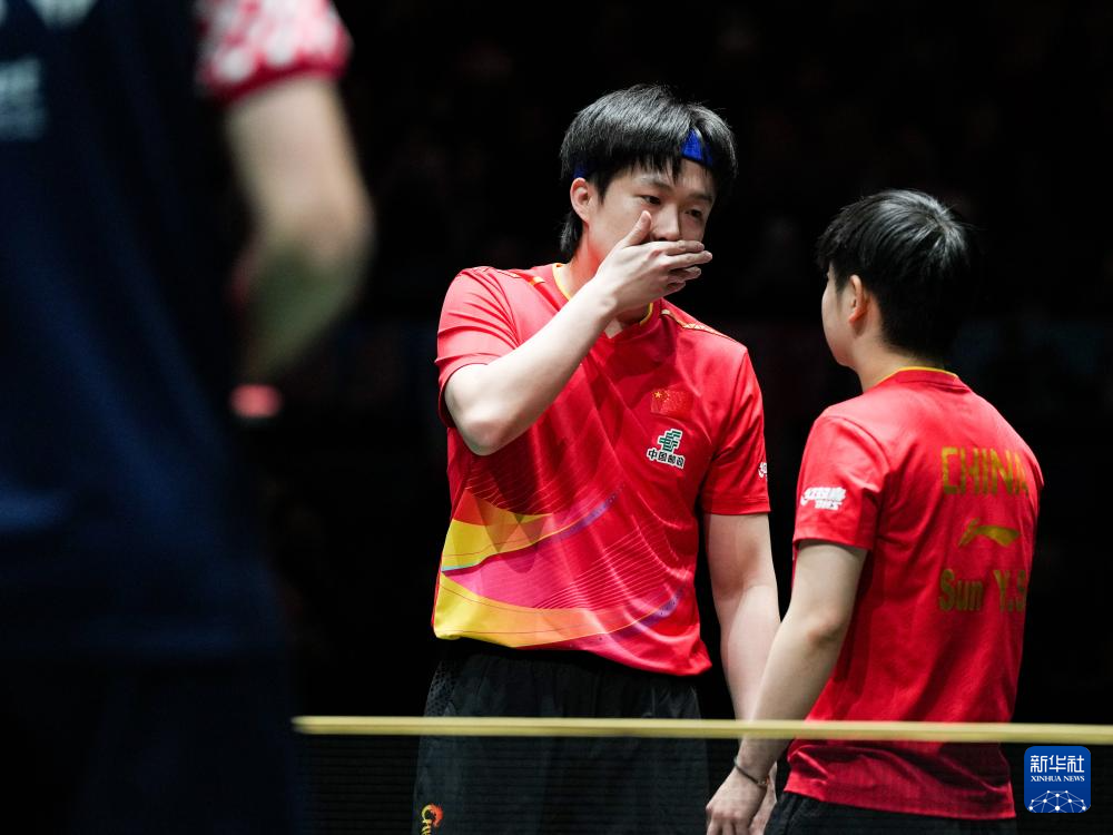 12月3日,中國隊組合王楚欽/孫穎莎(右)在混雙比賽中。他們3比0戰勝克羅地亞隊組合伊沃·本/哈娜·阿拉波維奇。
