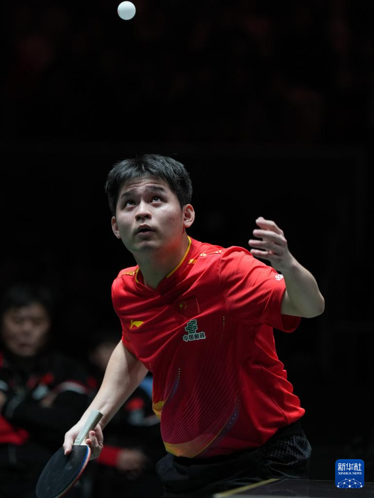 12月3日,中國隊選手林詩棟在男單比賽中發球。他2比0戰勝克羅地亞隊選手托米斯拉伕·普卡。
