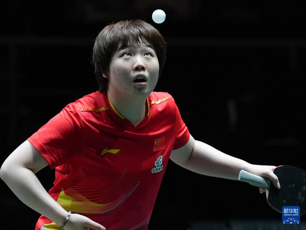 12月3日,中國隊選手蒯曼在女單比賽中發球。她3比0戰勝克羅地亞隊選手伊凡娜·馬洛巴比克。