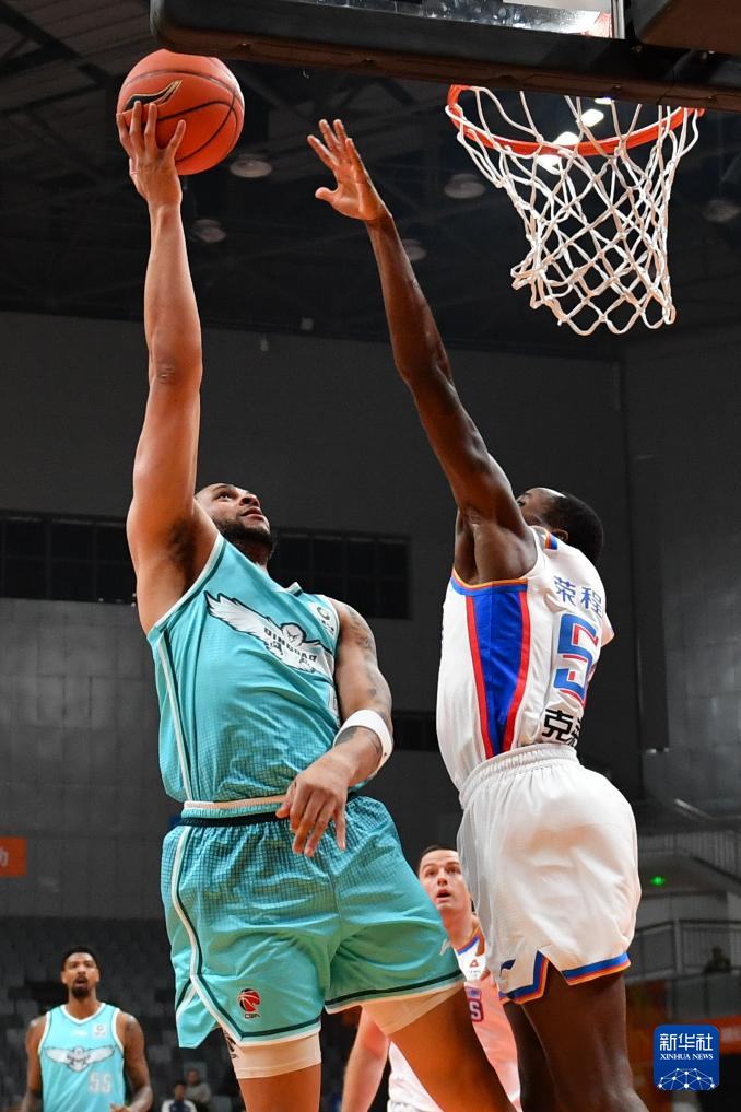 12月7日,青島嶗山啤酒隊球員王睿澤(右二)在比賽中上籃。