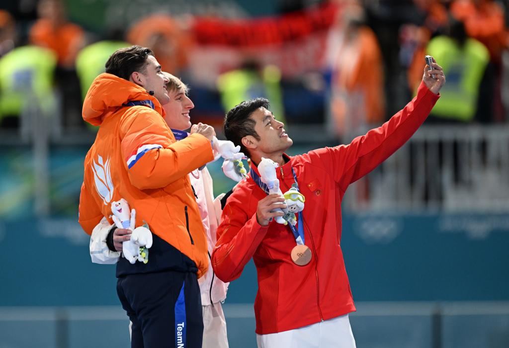 2月11日,冠軍美國選手斯托爾茲(中)、亞軍荷蘭選手德布(左)和季軍中國選手寧忠岩在頒獎儀式上自拍。新華社記者 武巍 攝