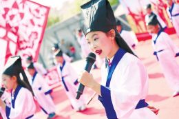 8月14日,在廣靈縣剪紙文化廣場,小演員們正在誦讀國學經典,這是該縣“文化納涼”展演節目之一。夏季以來,廣靈縣開展了以“助力脫貧攻堅、打造幸福廣靈,喜迎十九大勝利召開”為主題的“文化納涼”展演活動,讓群眾享受文化消暑大餐。(霍飛飛 攝)