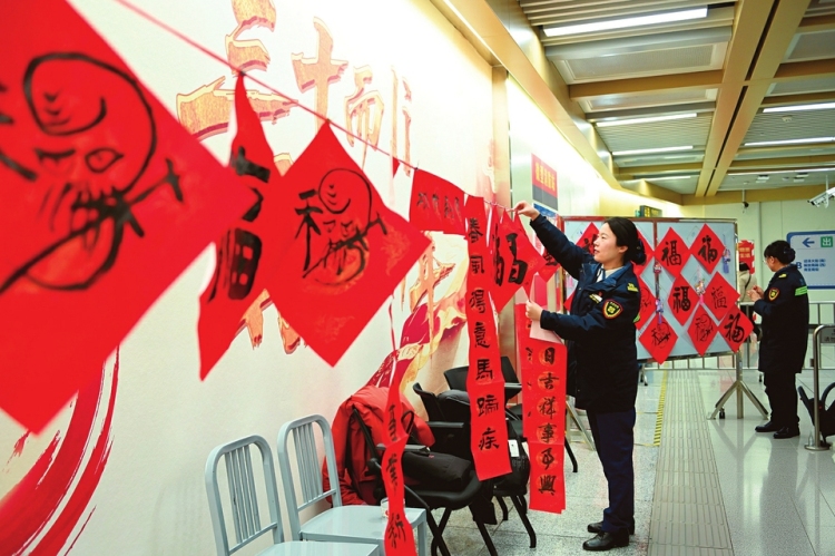 2月12日,“紅雁送福 廉獅迎新”新春送福主題活動,在太原地鐵大南門站、長風街站溫情啟幕。活動現場,書法家們用一幅幅書法作品為省城市民、地鐵職工及春運返鄉乘客送上新春祝福。(本報記者趙夏雨攝)