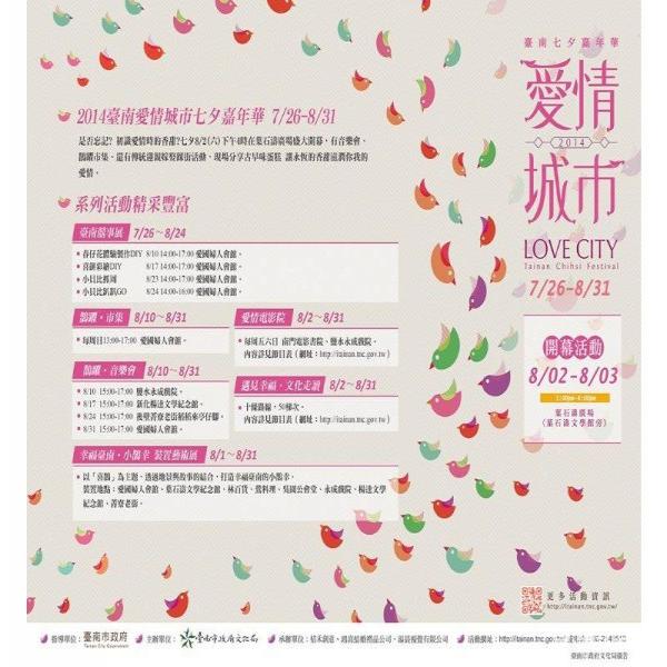 2014台南愛情城市七夕嘉年華系列活動自即日起至8/31登場,活動內容包含台南囍事展、鵲躍 主題市集、愛情電影院、鵲躍音樂會、文化走讀路線導覽、小鵲幸裝置藝術展等,8/2、3在葉石濤廣場將舉辦開幕活動,包含音樂會、踩街活動、有囍文創市集,歡迎民眾前來共襄盛舉。