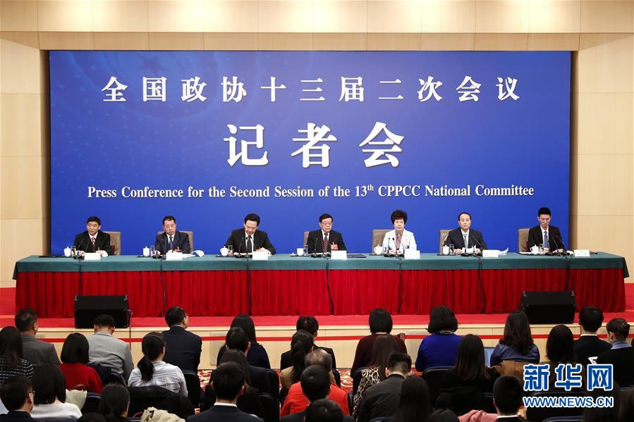 3月5日,全國政協十三屆二次會議新聞中心舉行記者會,邀請全國政協委員李偉、秦博勇、陳雨露、王培安、劉炳江談打贏防範化解重大風險、精準脫貧、污染防治三大攻堅戰。 新華社記者 王鵬 攝