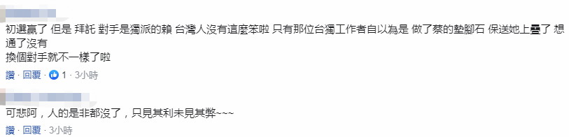 在蔡英文16日聲稱自己是“2020最好選擇”之後,也有島內網友分析,她的勝出只不過是因為對手是“獨派”的賴,賴做了蔡的墊腳石而已。