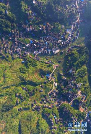 這是廣西融水苗族自治縣桿洞鄉錦洞村晨景(6月14日無人機拍攝)。 廣西融水苗族自治縣桿洞鄉梯田縱橫交錯,木樓星羅棋佈。夏日清晨,大苗山的田園在朝陽下美如畫卷。 新華社記者 黃孝邦 攝