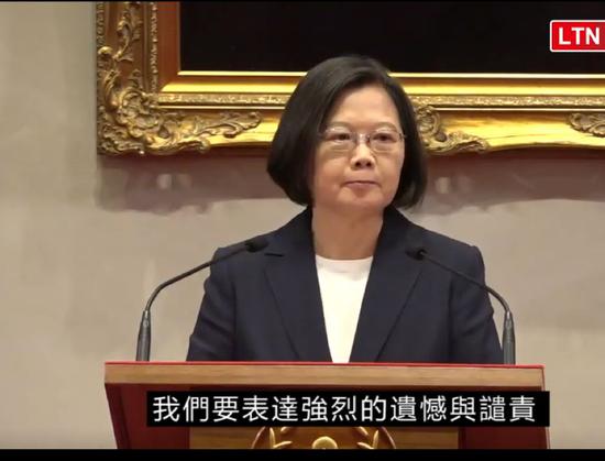 面色“鐵青”的蔡英文在記者會上將一切責任都推給了大陸(網絡視頻截圖)