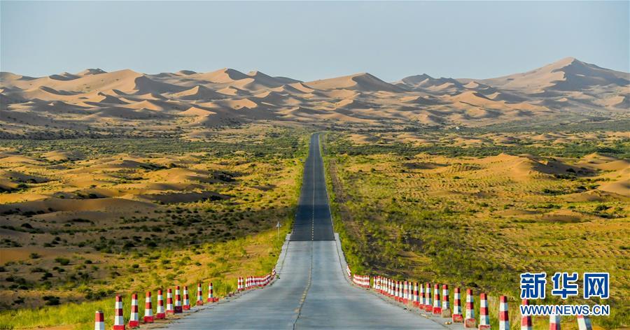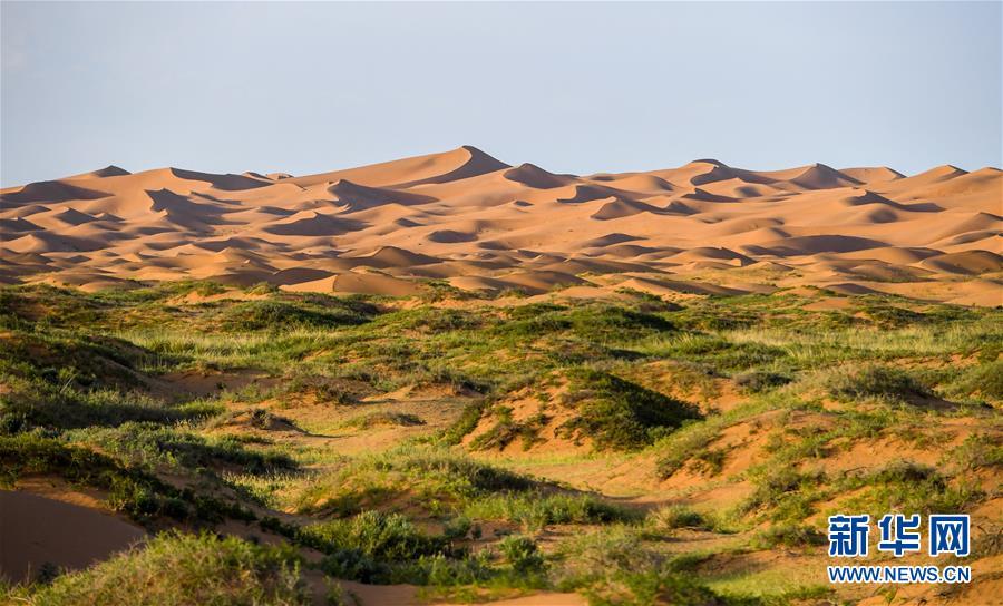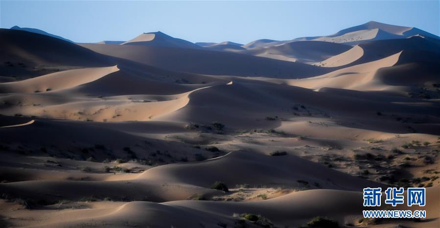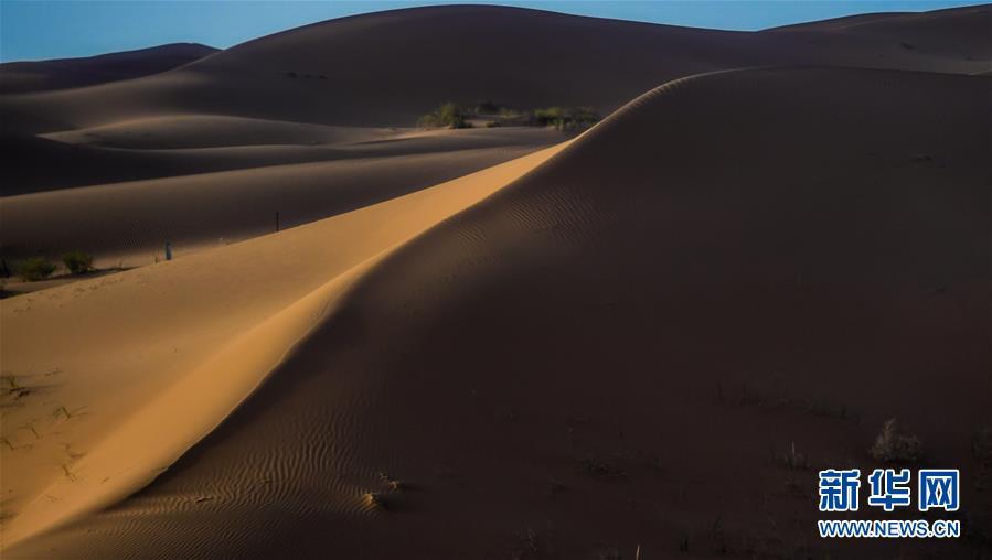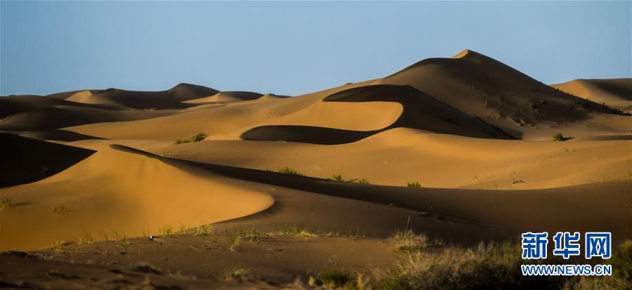 這是7月8日拍攝的騰格裏沙漠風光。 位於內蒙古自治區阿拉善左旗西南部和甘肅省中部邊境的騰格裏沙漠是我國第四大沙漠,總面積約為4.3萬平方公里。夏日傍晚,騰格裏沙漠連綿的沙丘被日光勾勒出美麗的線條,美不勝收。 新華社記者 連振 攝