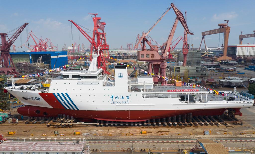 7月8日拍攝的“海巡08”輪(無人機照片)。當日,中國具備深遠海測量能力的專業海道測量船“海巡08”輪在中國船舶集團有限公司下水。新華社記者 丁汀 攝