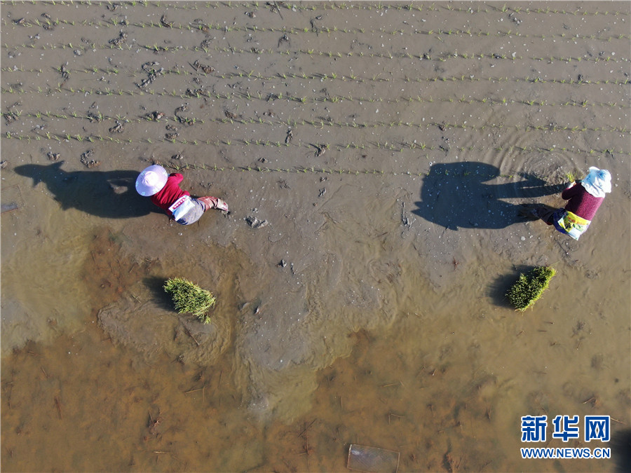 雲南省動海縣動遮鎮曼朗村村民在栽插水稻(2月13日攝)。